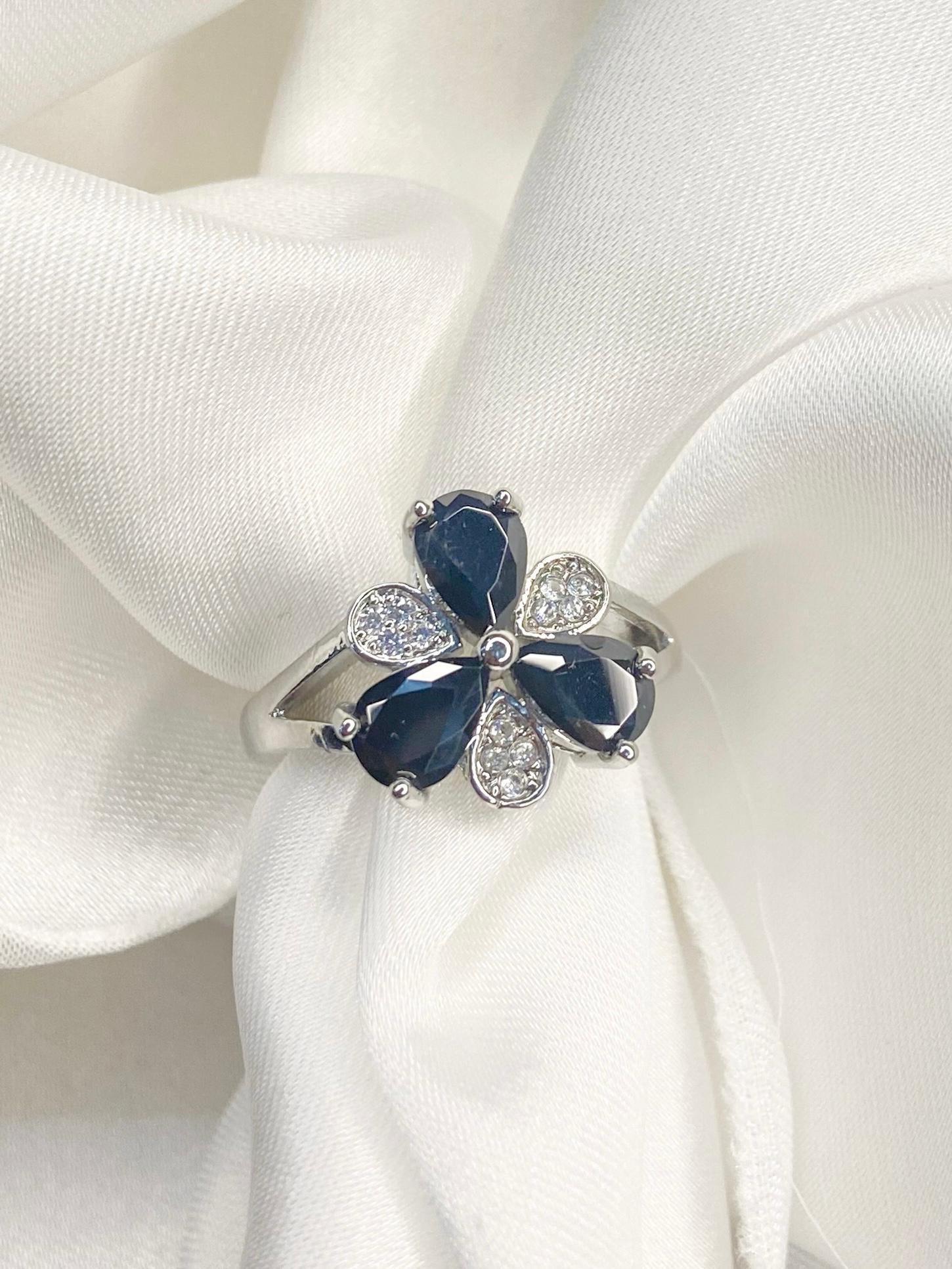 Bold and enchanting, the Black Three Stone Flower Ring features a striking floral design with three deep black stones. A perfect accessory for a modern, edgy, and elegant statement.