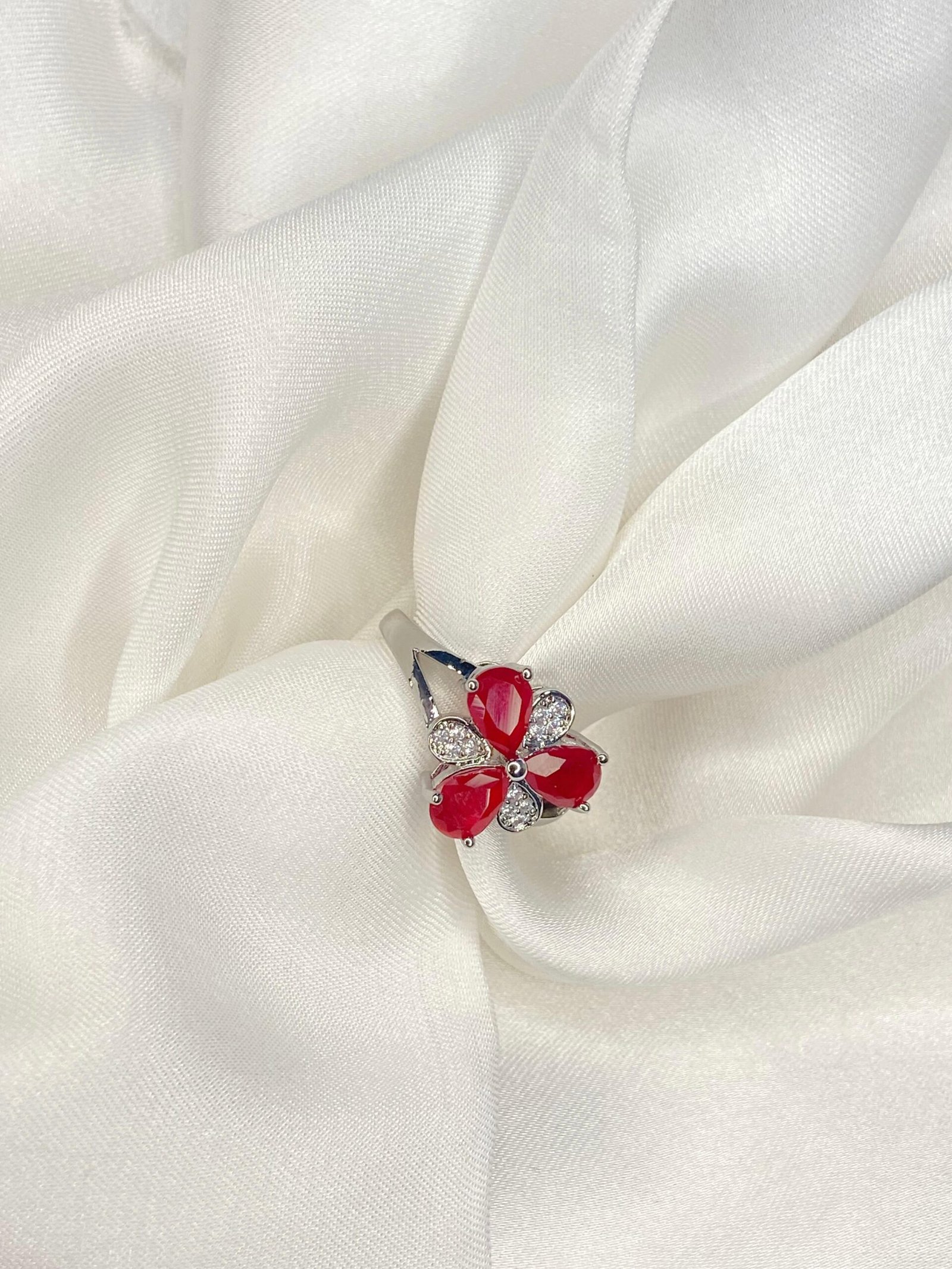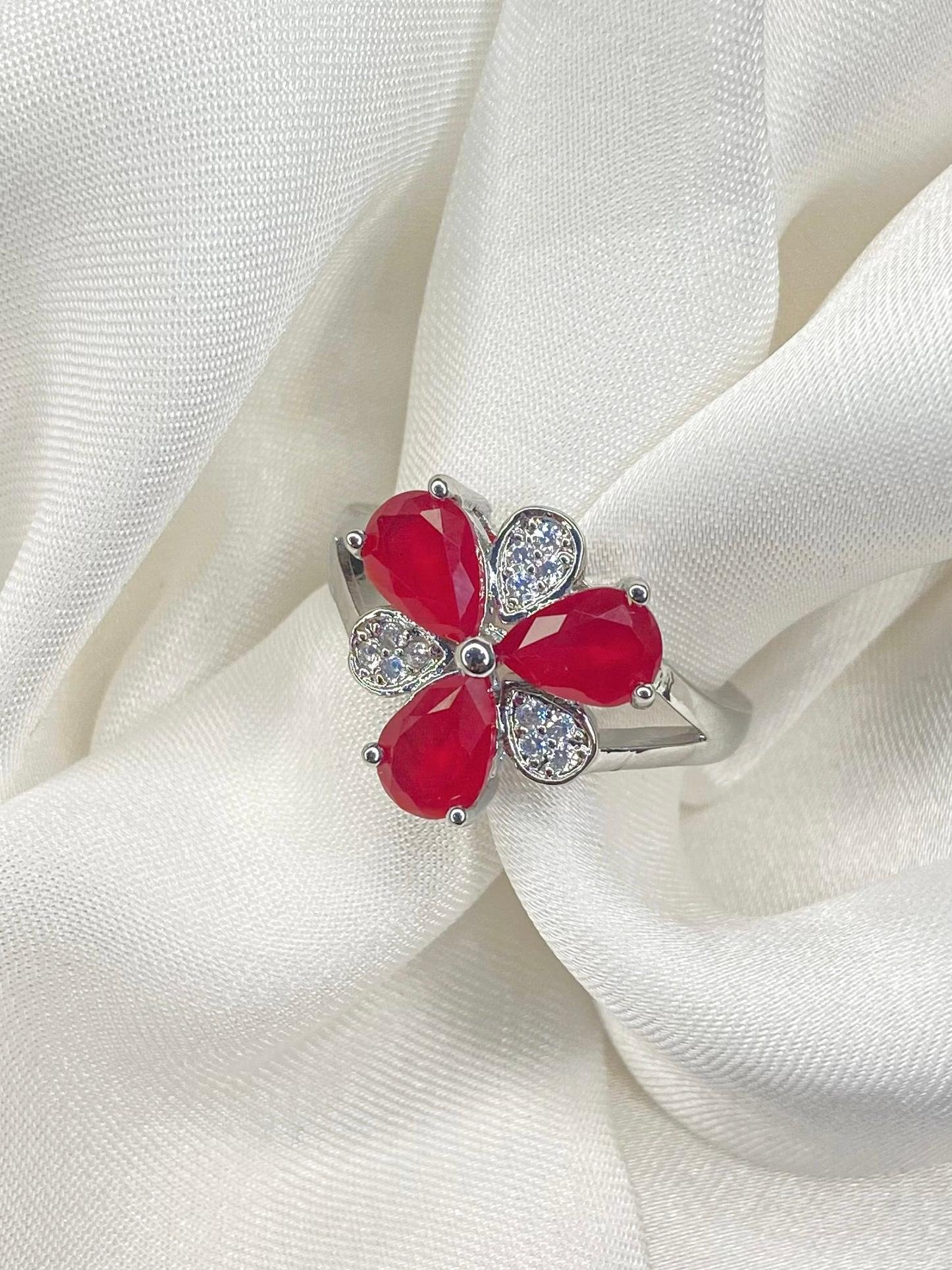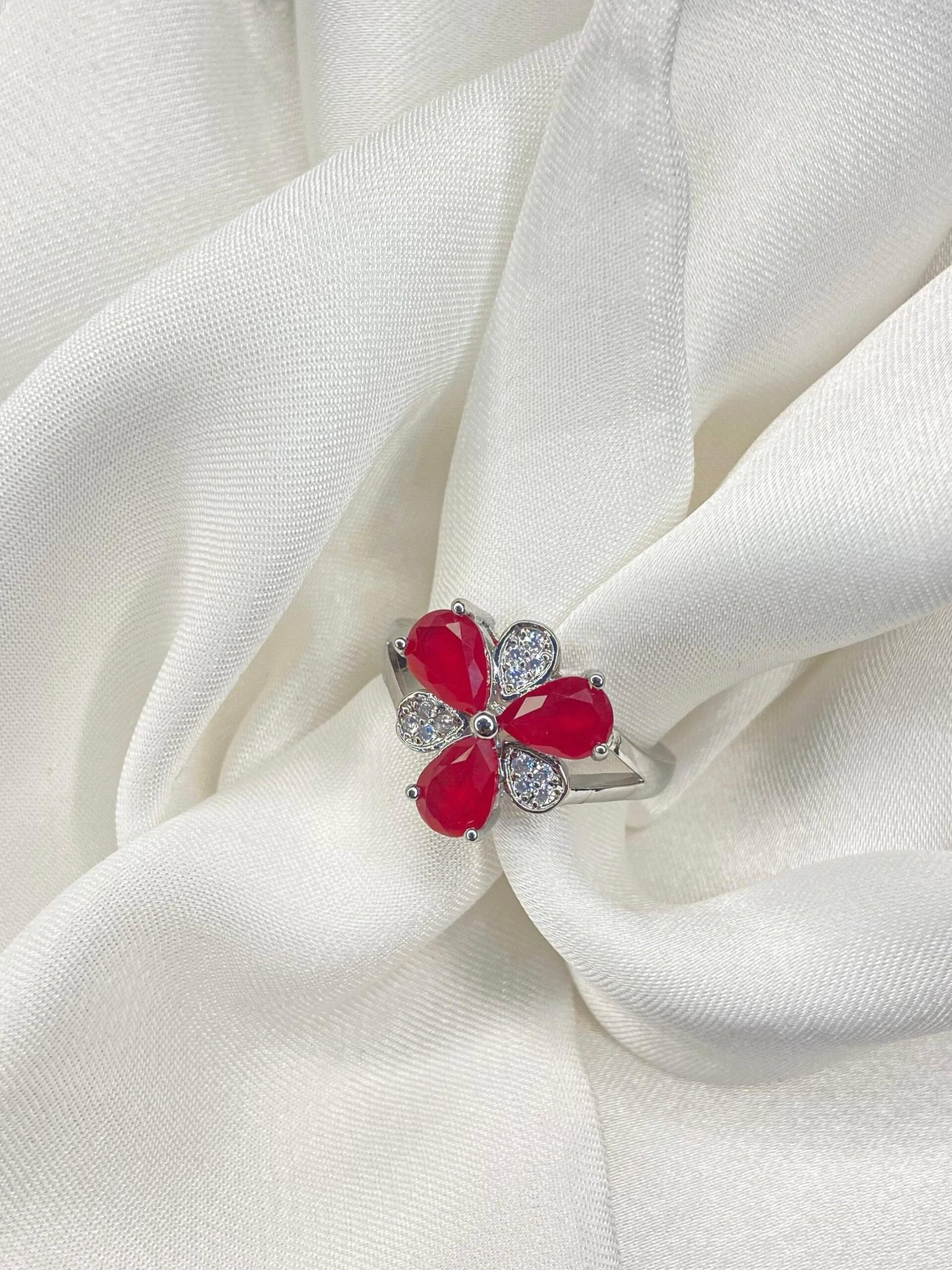 Vibrant and elegant, the Red Three Stone Flower Ring showcases a stunning floral design with three radiant red stones. Set in a stylish band, it adds a bold yet feminine touch to any look.