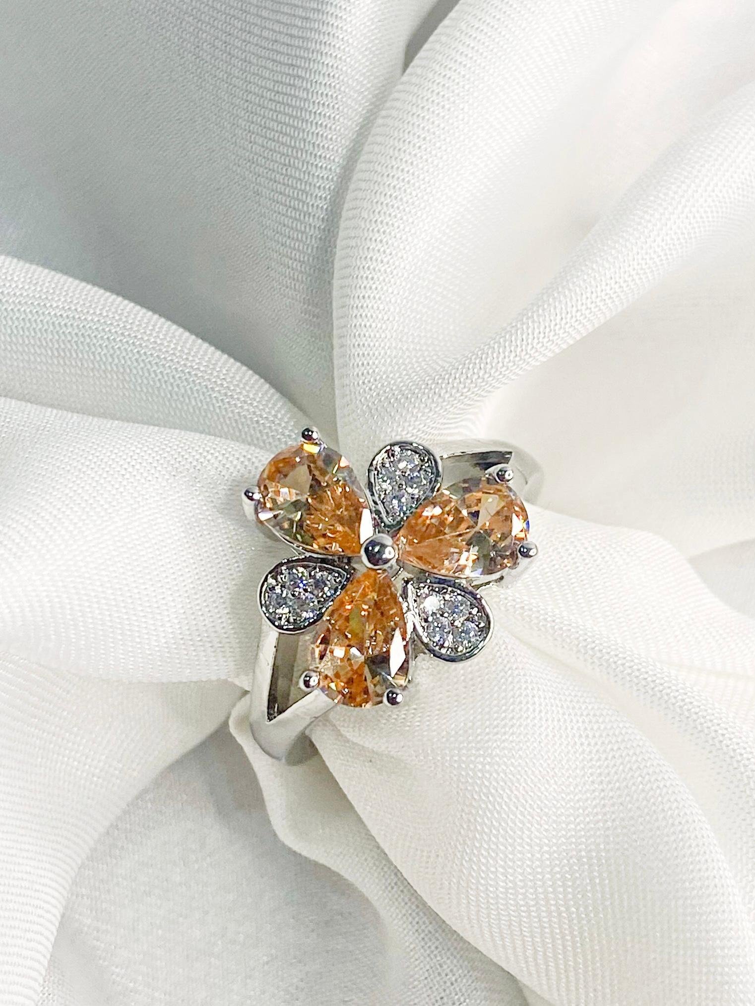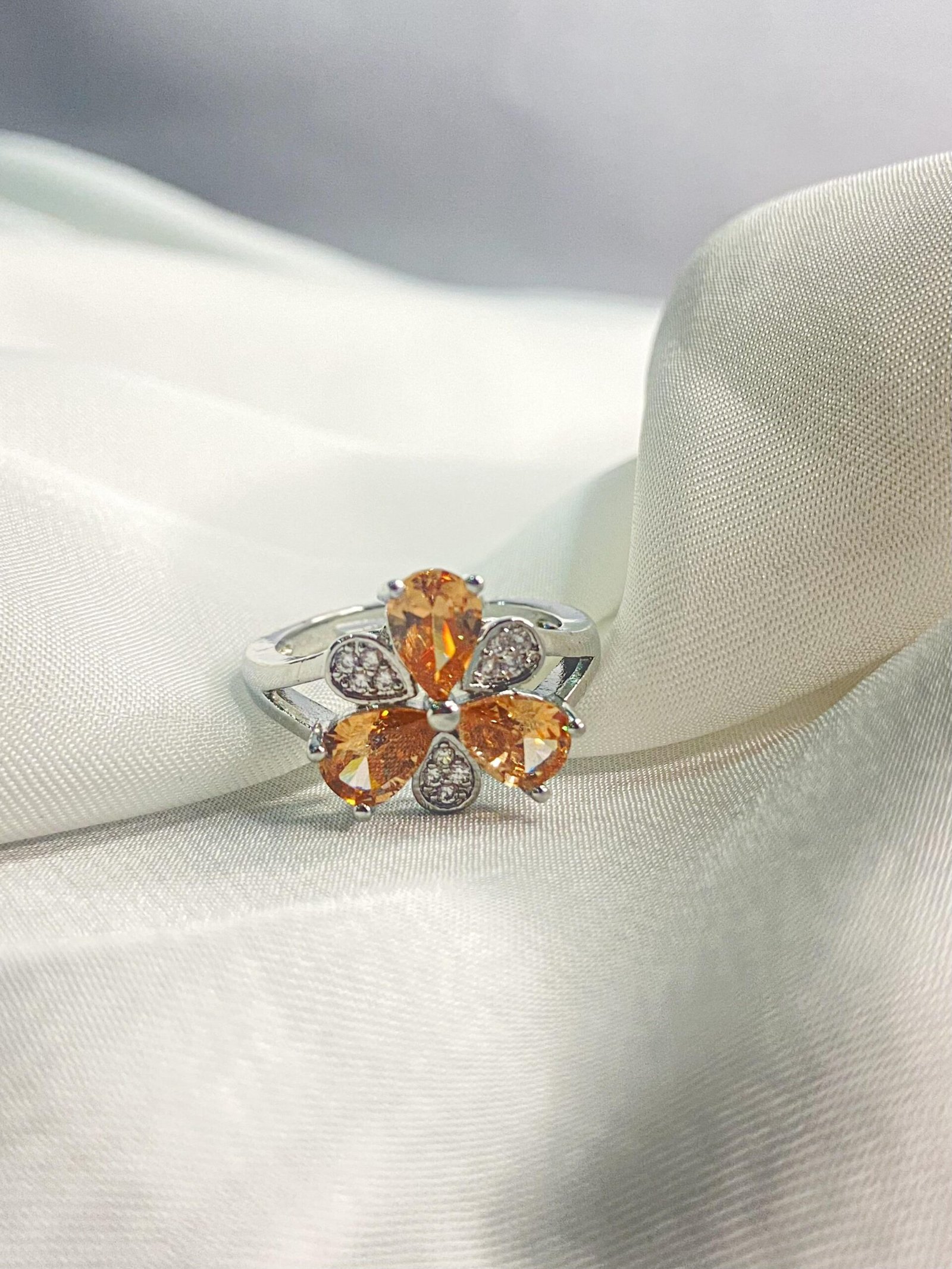 Delicate and charming, the Three Stone Flower Ring features a floral-inspired design with three sparkling stones at its heart. A graceful piece that adds a touch of natural beauty and elegance to your style.